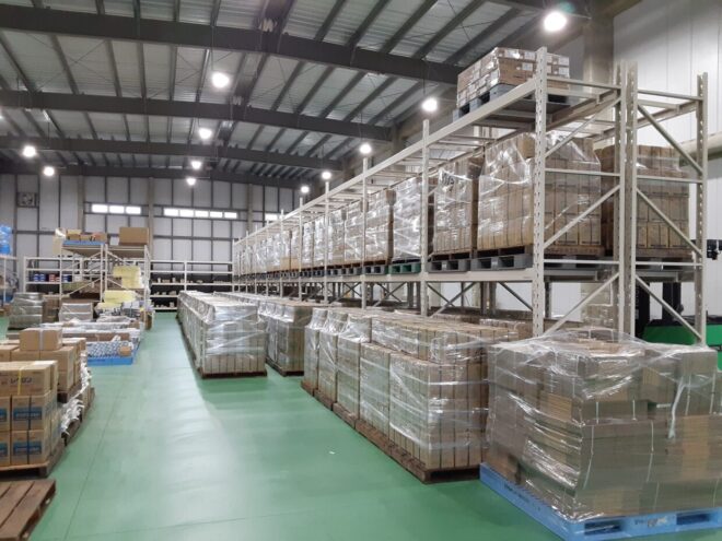 - 新設の倉庫(約1710㎡)に単体2段ラック24台、連結2段ラック100台を2度に分けて納入、設置しました。