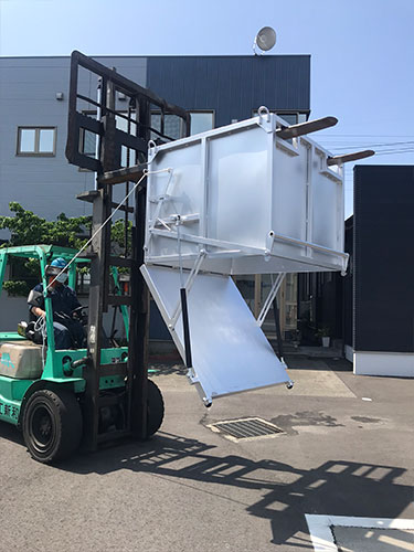 Dタイプはダンパー制御で開きます。ダンパーを使用することで床板がゆっくり開き静音でRタイプ・Lタイプより安全に衝撃が少なく中身を排出できます。また、空中で床板を開くことができるのでフォークリフトでの操作が簡単です。※こちらの商品は受注後の製作となります。※現在ダンパーの入荷に大変お時間を頂いております。納期はご相談ください。