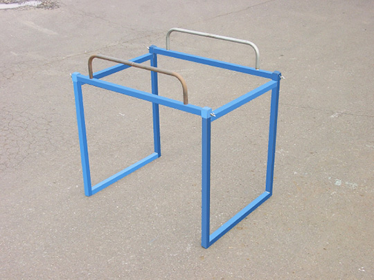 ドラム缶のサイズに合わせた保管用ラックです。落下防止のためサイドバーを5本取り付けました。前面サイドバーは取り外し可能なため、積載しやすくなっております。トラックへ手積みからラックのまま積載へ安全面も考慮したラックです。