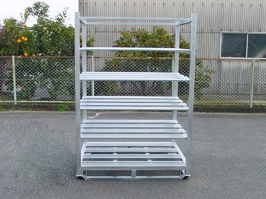 耐荷重1.5tの大型折り畳みラックです。外で使用する為錆びにくい溶融亜鉛メッキ仕様。未使用時は柱とバーを収納し段済み保管が可能です。