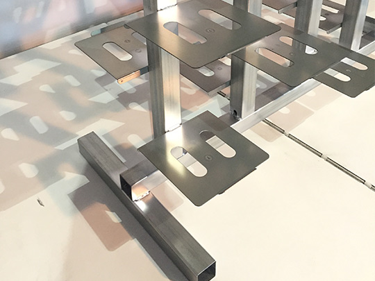 地震対策をご希望されていたお客様の特注の逆テナーです。上に置いた荷物が地震で横から落ちたり、格子状の天板から落下しないように板を取り付けました。また、アンカーが打てる取付金具がセットです。