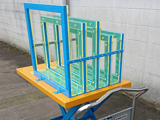 ボンベ積載用の特注ラックです。スロープ付きの為、出し入れがスムーズにできます。