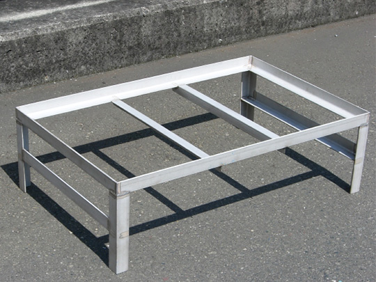 木材乾燥機にフォークリフトで運べるステンレス製特注ラックです。衛生面や積載物を考慮して設計・製作しています。
