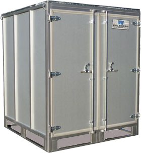 建設現場の機材保管、作業工具の収納、備蓄用倉庫など、様々な用途で利用できる一坪サイズのコンテナ。フォークリフトで移動ができるので、各作業現場にコンテナをそのまま持ち運ぶことが可能。和新工業の物流機器の中でも、多くのお問合せをいただく人気商品。